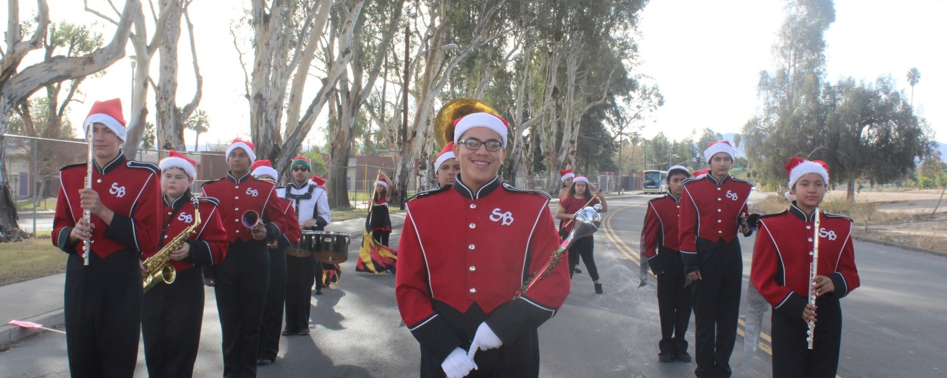 On Saturday December 9th, the San Bernardino YMCA put on their annual Christmas Children Parade where local businesses, elementary school cheerleaders, and high school bands rocked the morning away with traditional Christmas music and festive lights. Every child, old and young, were happy to welcome Santa Claus to our town. Our very own Cardinal City Band marched proudly, led by Drum Major Eduardo Negrete, Drum Captain Rogelio Jacques, and Assistant Drum Major Javier Molina. They played Seven Nation Army, Fight Song, Crazy Love, Let It Snow, G6, Hey Song, Malaguena and Aztec Fire. Our SBHS Color Guard Team, led by their captain, Kybeth Ruiz, danced the day away with Christmas songs.