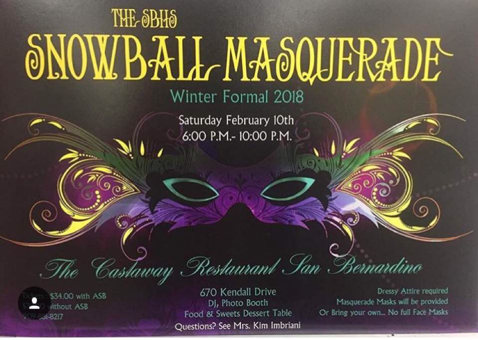 This year’s Snowball Masquerade-themed Winter Formal will be held on February 10th from 6:00-10:00 pm at the lovely Castaway Restaurant here in San Bernardino. You can buy your tickets from Mrs. Kim in M-9. Tickets are $34 with ASB and $39 without. This elegant dance will include an amazing DJ, a professional photo booth and breathtaking views. There will be a royal court crowned, so be there to see who wins. Nominees must purchase a ticket and attend Winter Formal in order to be crowned. Final voting will take place at the dance itself, so make sure to get your ticket today!