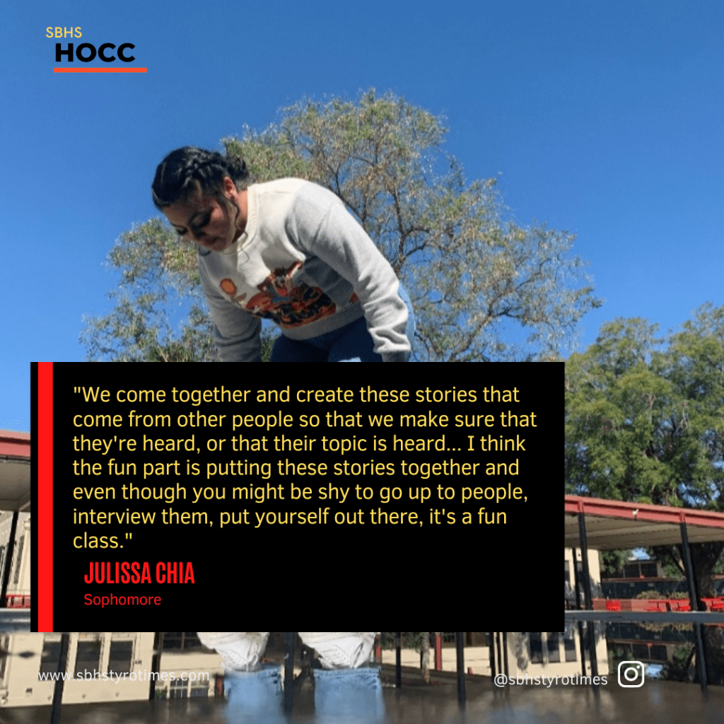 Journalism is a class/program where students of SBHS come together and write news articles, profiles, sports events, and more for Tyro Times . Tyro Times reports on current events or anything that affects SBHS. Many articles have been published throughout the years, articles such as COVID-19 reports, sports, tips for sleeping, sibling rivalry, and even student advice. This class also teaches you the basis of photography. We show you how to take the perfect picture with only a few tricks. You will be provided with a camera if needed. The class isn’t just about writing either. You can create other types of content as well: videos, art, comics, photo stories, etc.