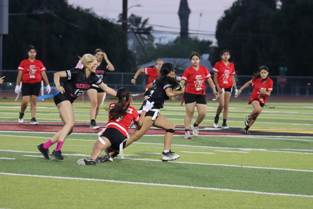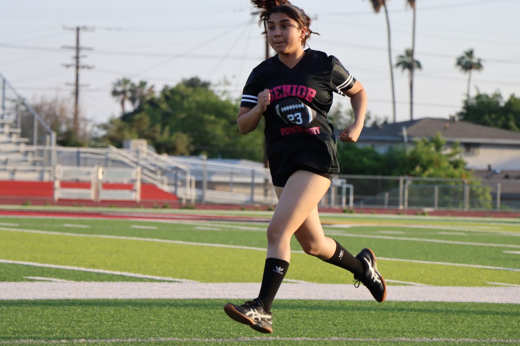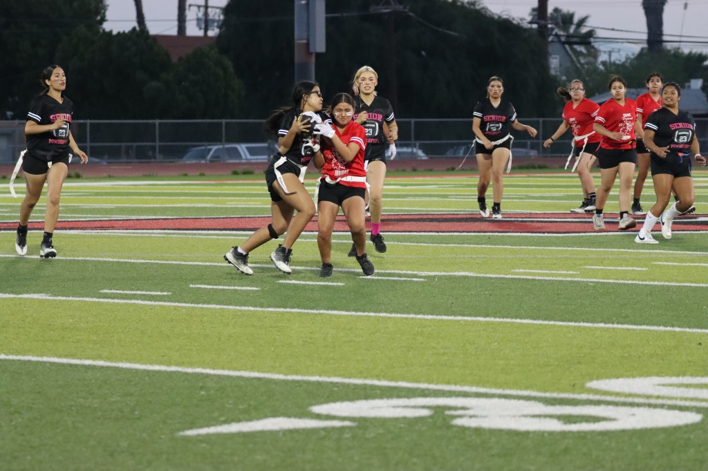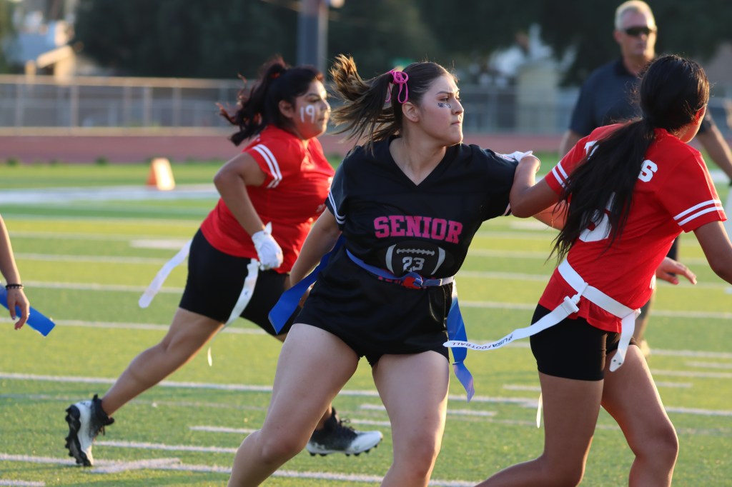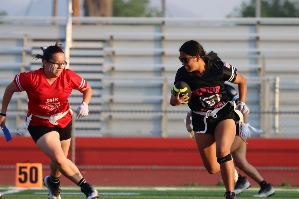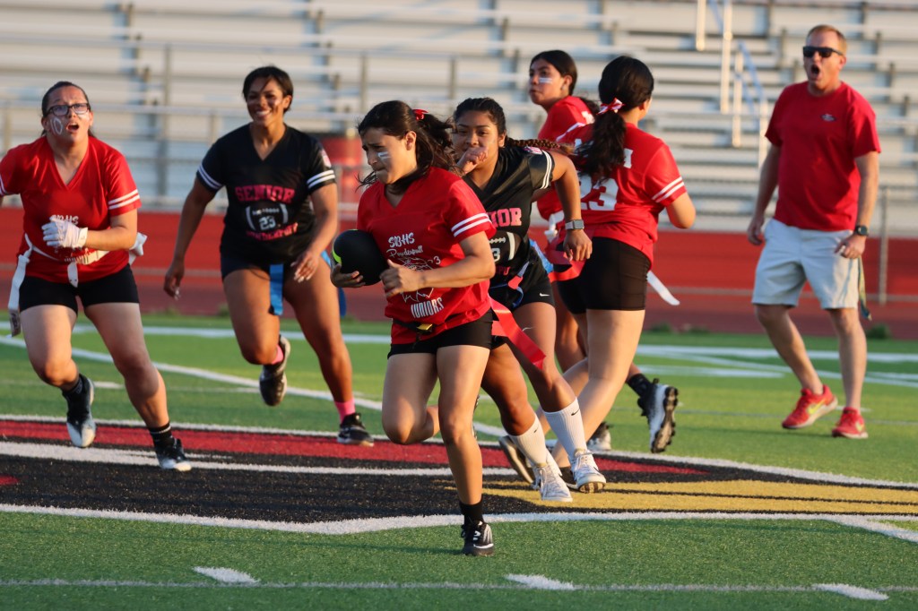 The seniors showed up for the annual Powderpuff game against the juniors on Thursday, May 18, 2023. The seniors commanded the game from beginning to end, keeping the juniors out of the end zone. The final score was 28-0.
