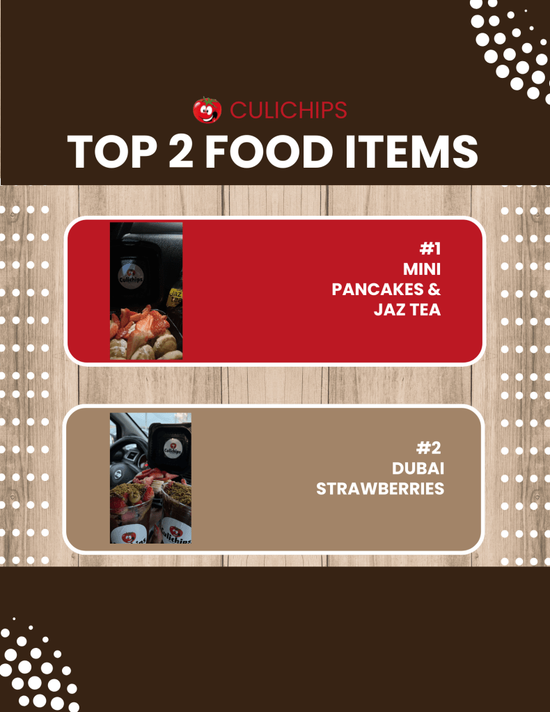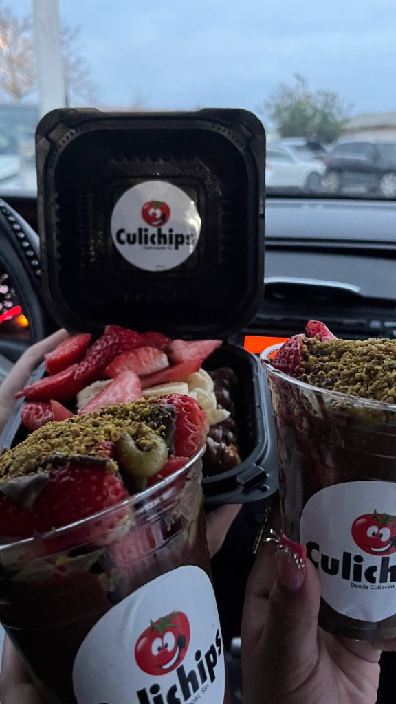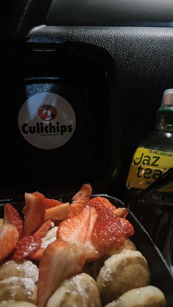 The fifteen mini pancakes are small bite sized pancakes topped with your own choice of toppings and they have many options to choose from such as bananas, strawberries, nutella, lechera, tres leches, etc. The pancakes themselves are soft and squishy which includes a delicious flavor of sweetness. Next, the dubai strawberries, which are viral on TikTok, Culichips has also made strawberry dubai mini pancakes. They are fresh strawberries with creamy pistachio, crunchy kataifi, and milk chocolate. The most specific way I can explain the taste is like sweet strawberries mixed with peanut butter and chocolate, the texture is mixed with soft and crunchy. Lastly, the jaz tea, it is a popular brand in Sinaloa which is jasmine tea infused with tea leaves with jasmine blossoms, it has a tart but refreshing taste and then it has a sweet aftertaste.