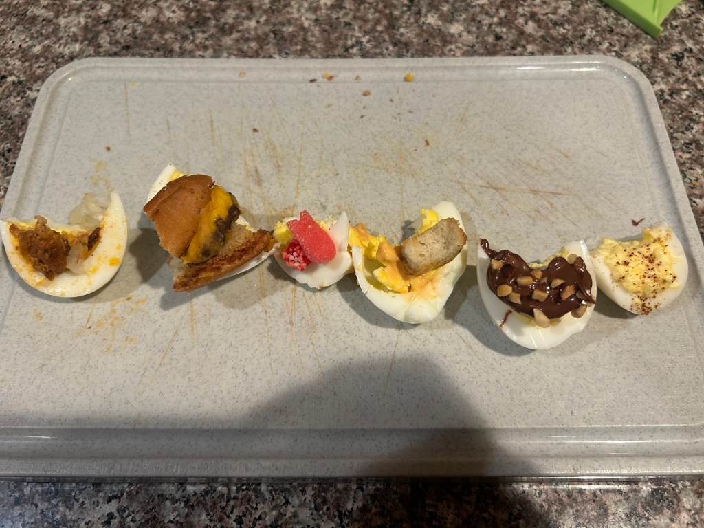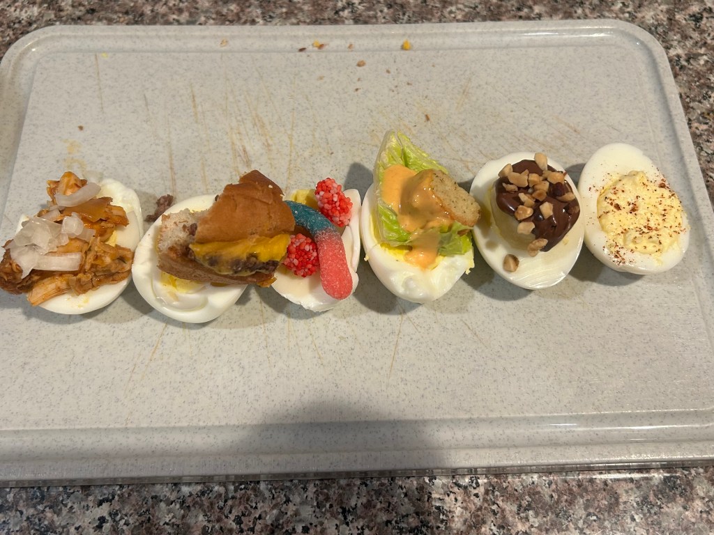 For the first egg it is called Chegg, It has chicken on top with onions. The second egg is called Hegg. It has a hamburger on top of the egg. For the third egg it is called Gegg it has a gummy worm and two nerd clusters on top. The fourth egg is called Segg. It has lettuce, a crouton , and a thousand island dressing on top. The fifth egg is called Begg. It has banana, nutella, and peanuts on top. Lastly the sixth egg is a classic deviled egg.